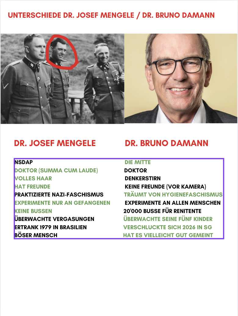 Es gibt deutliche Unterschiede zwischen Bruno Damann und dem Naziarzt Dr. Josef Mengele. (Unter anderem der Doktortitel.)