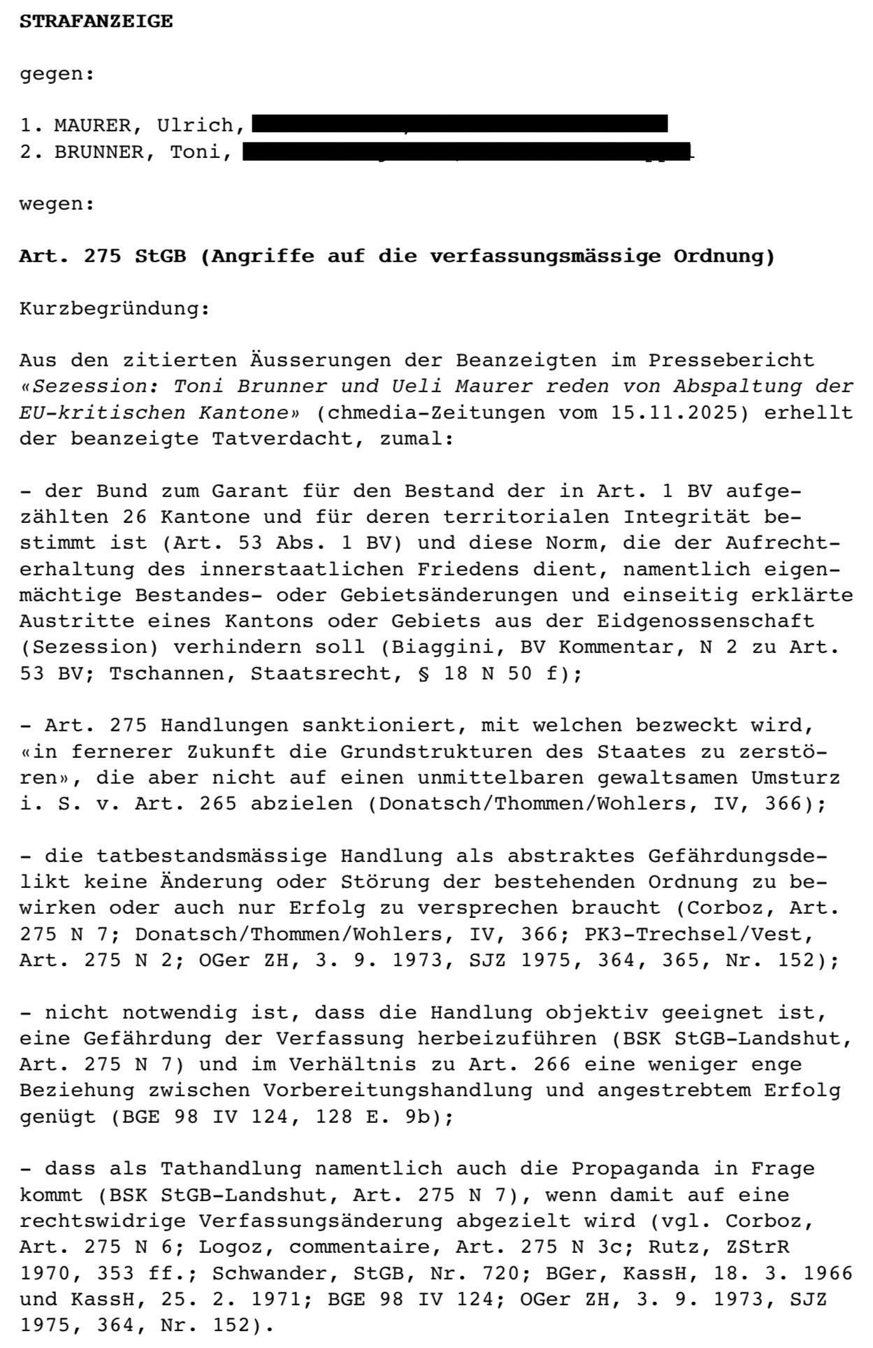 Mit dieser Strafanzeige macht sich Loris Fabrizio Mainardi erst recht unmöglich. Die Anzeige lautet auf Artikel 275 StGB Angriff auf die Verfassungsmässige Ordnung.